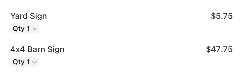 When using this form, you’ll notice that 1 of each sign is automatically selected, allowing you to see the total cost of each type of sign. You’ll need to use the drop down menu to adjust the quantity of signs you’d like to order. For example, if you do NOT want any 4x4 barn signs, simply adjust the quantity to “0” and that item and cost will be removed from your cart. Pick up is M-F during regular business hours at: 6010 N Crestwood, Suite E, Richmond, VA 23230. We’ll let you know when your order is ready!